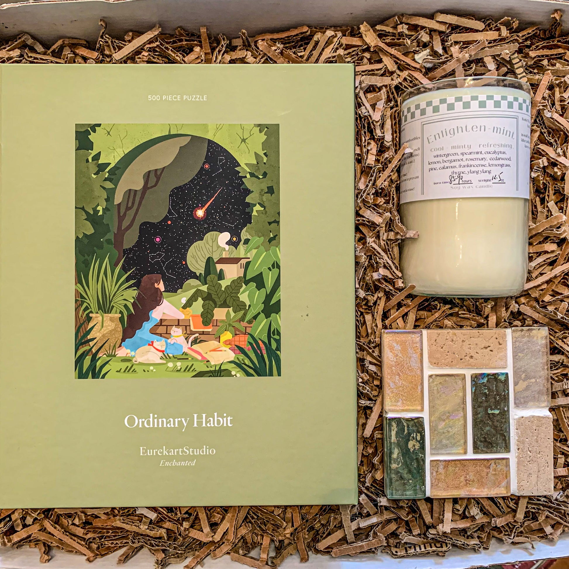 This thoughtfully curated set includes a captivating 500-piece puzzle, a soothing soy candle with a refreshing mint scent, and a stylish coaster. Perfect for anyone who cherishes quiet nights in, this gift box promises a serene escape into relaxation and mental engagement.