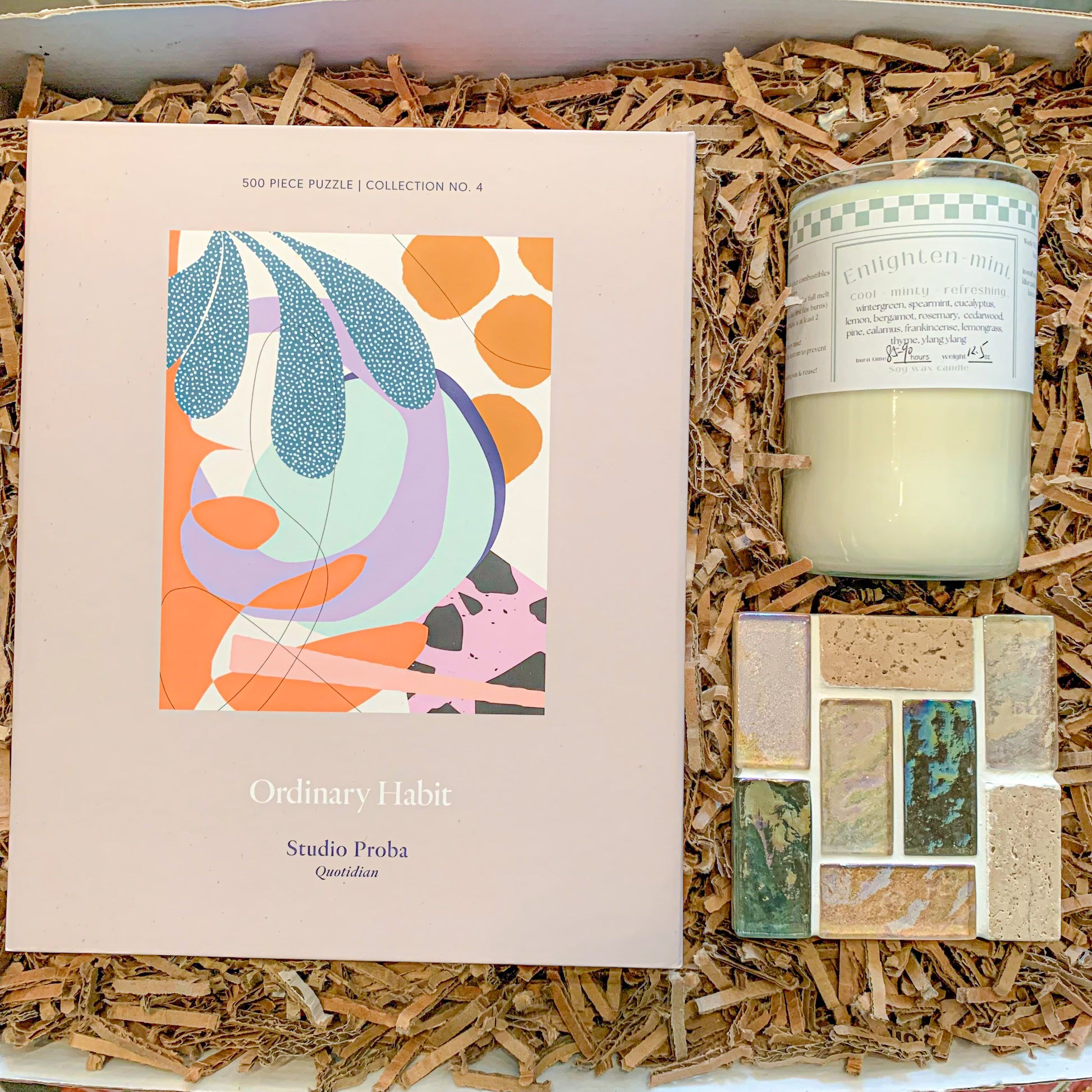 Each Ordinary Habit puzzle is mindfully made in collaboration with different illustrators. Information on both the artist and puzzle can be found on the back of the box.